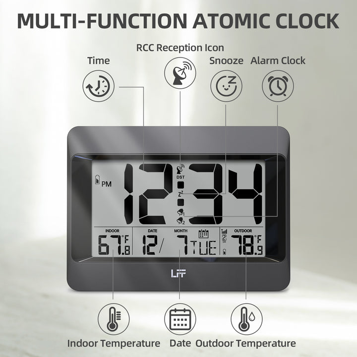 The digital atomic wall clock is a simple and easy to read clock with indoor & outdoor temperature, date, DST, and alarm. The Atomic clock has a built-in receiver that automatically synchronizes itself with the WWVB radio broadcast. The Atomic Clock will always be accurate as it receives daily WWVB updates.